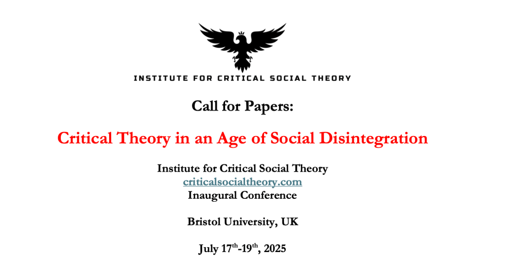 The Institute for Critical Social Theory would like to invite you to our inaugural conference, being held at the Bristol University (UK), July 17-19, 2025. The conference theme is, “Critical Theory in an Age of Social Disintegration.” Below is the Call for Papers. The deadline to submit your abstract is February 15th. Please consider joining us!