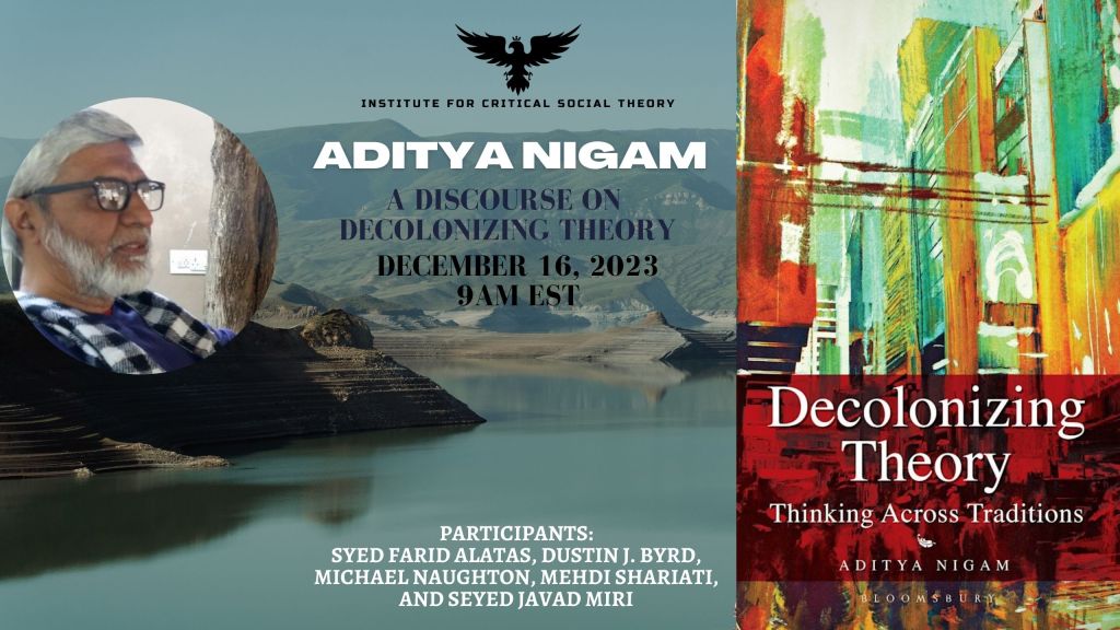 On February 11th, 2024, members of the Institute for Critical Social Theory will join Aditya Nigam to discuss his book, Decolonizing Theory: Thinking across Tradition. The participants include Syed Farid Alatas, Dustin J. Byrd, Michael Naughton, Mehdi Shariati and Seyed Javad Miri. The video can be found here: Aditya Nigam.