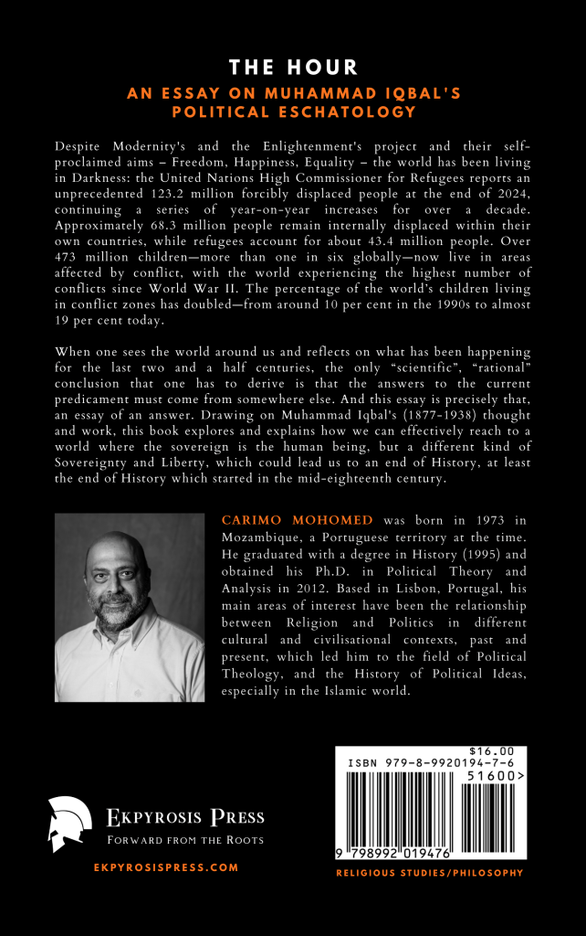 Carimo Mohomed has released his new book, The Hour: An Essay on Muhammad Iqbal’s Political Eschatology, published by Ekpyrosis Press. Here’s the abstract: Despite Modernity’s and the Enlightenment’s project and their self-proclaimed aims – Freedom, Happiness, Equality –, the world has been living in Darkness: the United Nations High Commissioner for Refugees (UNHCR) reports an unprecedented 123.2 million forcibly displaced people at the end of 2024, continuing a series of year-on-year increases for over a decade. Approximately 68.3 million people remain internally displaced within their own countries, while refugees account for about 43.4 million people. Over 473 million children—more than one in six globally—now live in areas affected by conflict, with the world experiencing the highest number of conflicts since World War II. The percentage of the world’s children living in conflict zones has doubled—from around 10 per cent in the 1990s to almost 19 per cent today. When one sees the world around us and reflects on what has been happening for the last two and a half centuries, the only “scientific”, “rational” conclusion that one has to derive is that the answers to the current predicament must come from somewhere else. And this essay is precisely that, an essay of an answer. Drawing on Muhammad Iqbal’s (1877-1938) thought and work, this book explores and explains how we can effectively reach to a world where the sovereign is the human being, but a different kind of Sovereignty and Liberty, which could lead us to an end of History, at least the end of History which started in the mid-eighteenth century. It is available through Ekpyrosis Press, Amazon (US), and Lulu (US & International).