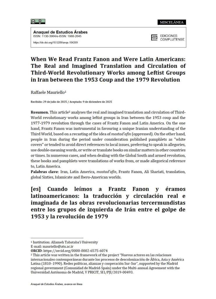 ICST member, Raffaele Mauriello recently published his new article entitled, “When we read Frantz Fanon and were Latin Americans: The Real and Imagined Translation and Circulation of Third-World Revolutionary Works among Leftist Groups in Iran between the 1953 Coup and the 1979 Revolution.” It was published in the journal, Anaquel de Studios Árabes. The entire article is open access: Here.